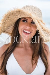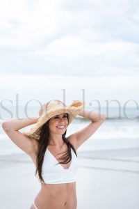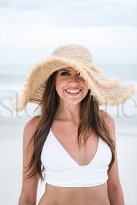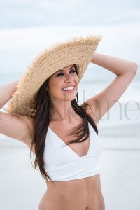 Vertical  photo of a woman wearing a white bikini at the beach.