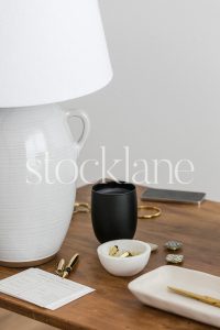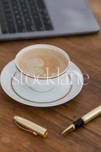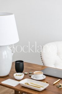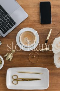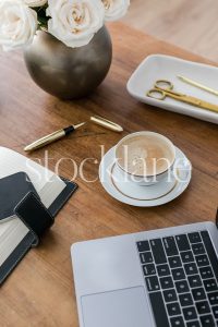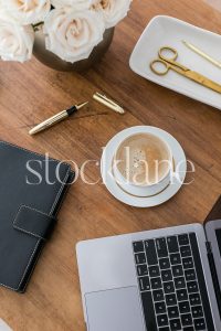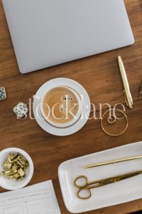 Vertical stock photo of a desk with a computer, a cup of coffee and other desk supplies, in gold and neutral colors.