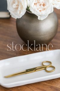 Vertical stock photo of gold scissors on a white tray, with flowers on the background.