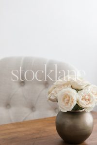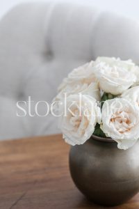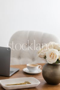 Vertical stock photo of a desk with a laptop computer, a vase with white roses, and a cup of coffee