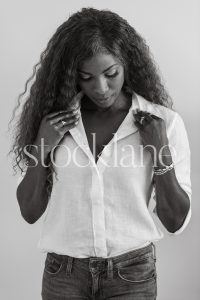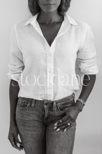 Vertical stock photo of a woman wearing jeans and a white shirt, leaning against a wall.
