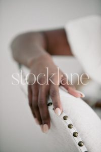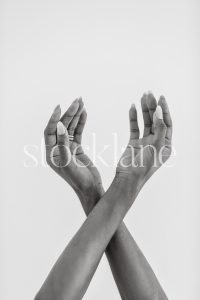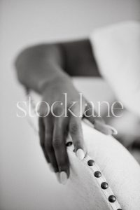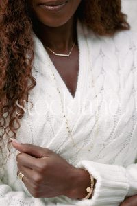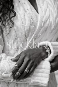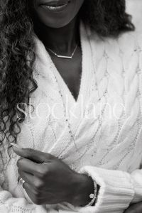Vertical black and white stock photo of a woman wearing a chunky knit white sweater.