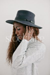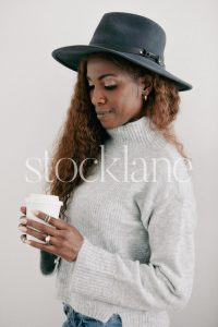 Vertical stock photo of a woman wearing a gray sweater and a hat, holding a cup of coffee.
