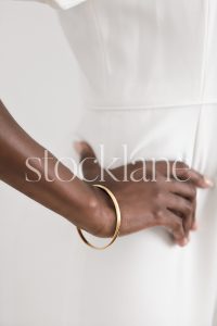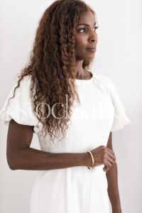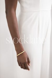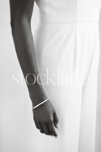 Vertical black and white photo of a woman in a white jumpsuit, her arm by her side.
