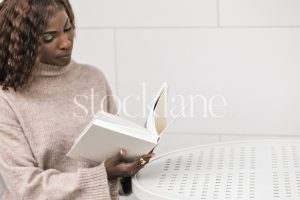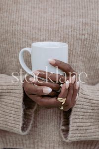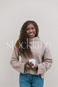 Vertical stock photo of a woman wearing a neutral colored sweater and jeans, holding a cup of coffee.