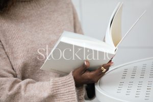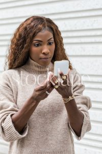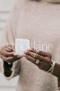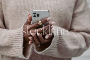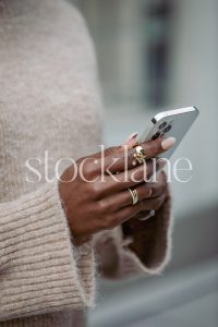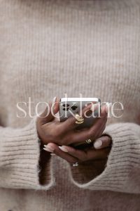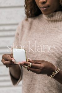 Horizontal stock photo of a woman wearing a neutral colored sweater, holding a phone.