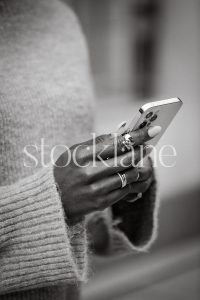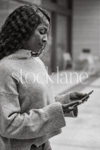 Vertical black and white stock photo of a woman wearing a neutral colored sweater, holding a phone.