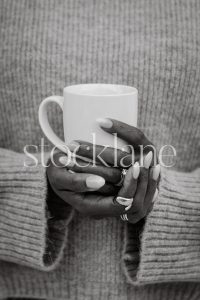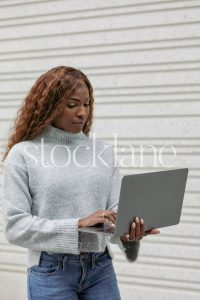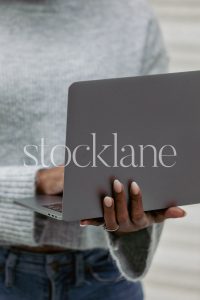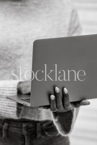 Vertical black and white stock photo of a woman wearing a gray sweater holding a laptop computer.