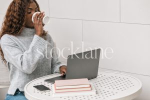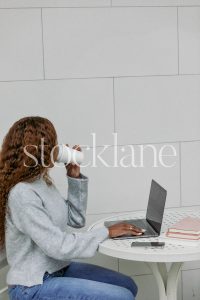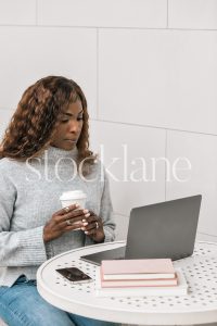 Vertical stock photo of a woman having a cup of coffee while working on her laptop computer.