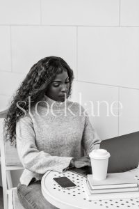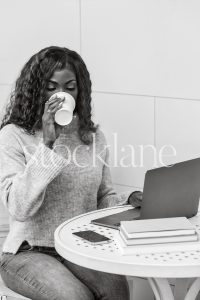Vertical black and white stock photo of a woman having a cup of coffee while working on her laptop computer.