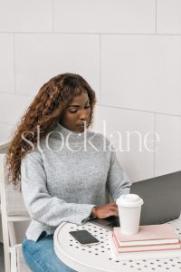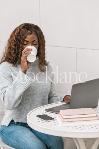 Horizontal stock photo of a woman having a cup of coffee while working on her laptop computer.