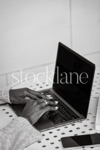 Vertical black and white stock photo of a woman’s hands over the keyboard of a laptop computer.