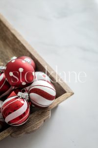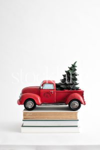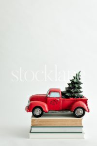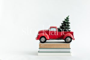 Horizontal stock photo of a red truck with a Christmas tree ornament on top of books.