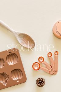 Vertical stock photo of baking utensils on a neutral background.