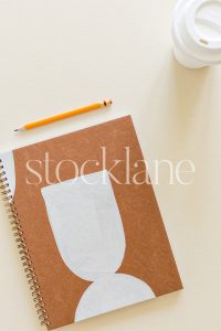 Vertical stock photo of a notebook and coffee on a neutral background.