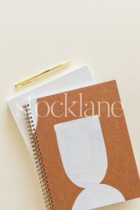 Vertical stock photo notebooks and a gold pen on a neutral background.