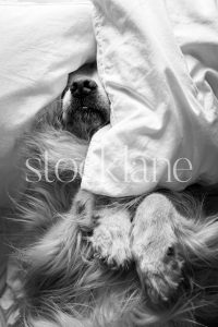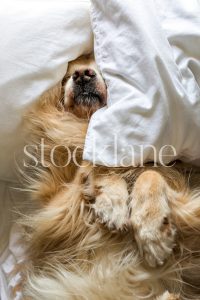 Vertical stock photo of a golden retriever dog on a bed covered in pillows.