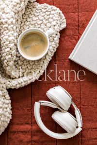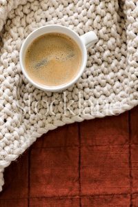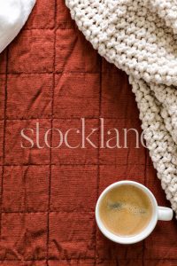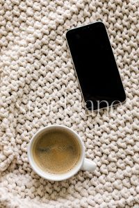 Vertical stock photo of a coffee cup and a phone on a neutral colored blanket.