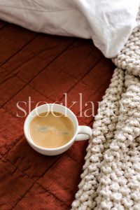 Vertical stock photo of a cup of coffee on a bed.