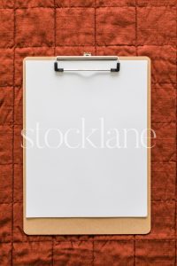 Vertical stock photo of a clipboard with white paper on a rust colored blanket.