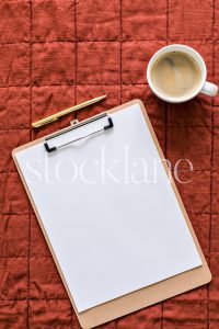 Vertical stock photo of a clipboard and a cup of coffee on a rust colored blanket.