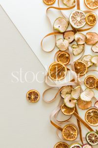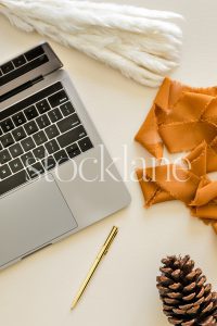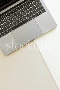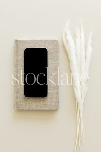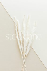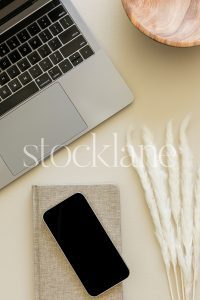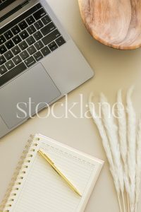 Vertical stock photo of a notebook, a laptop and white dried floral on a neutral background.