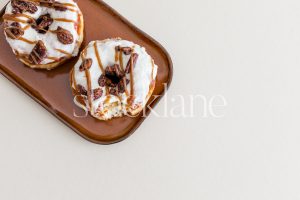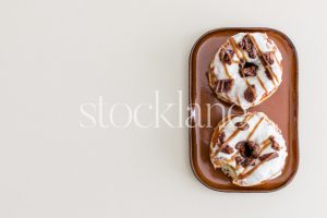 Horizontal stock photo of a plate with two fall-themed donuts on a brown and neutral background.