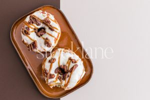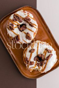 Vertical stock photo of a plate with two fall-themed donuts on a brown and neutral background.