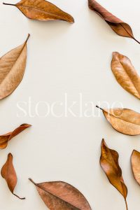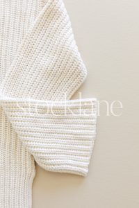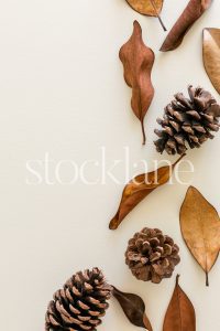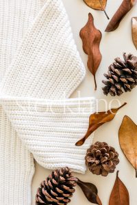 Vertical stock photo of a white sweater with brown leaves and pinecones on a neutral background.