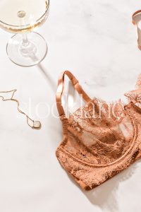 Vertical stock photo of a champagne glass, a necklace and a rust-colored bra on a marble surface.