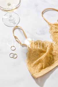 Vertical stock photo of a champagne glass, a rings and a yellow bralette on a marble surface.