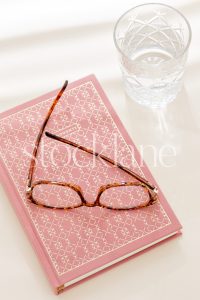 Vertical stock photo of a pink notebook, with tortoise glasses on top, and a glass of water, with sunlight coming through window blinds.