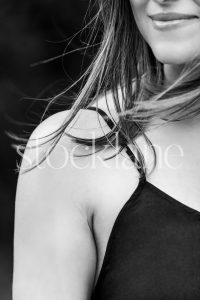 Vertical black and white photo of a woman with her hair blowing in the wind.