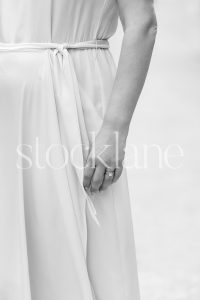 Vertical black and white photo of a woman wearing a white dress.