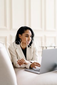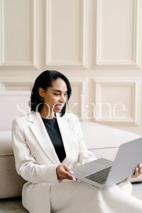 Vertical stock photo of a woman wearing a white suit, working on a laptop computer.