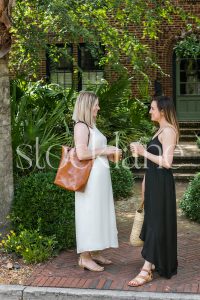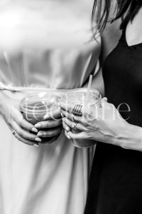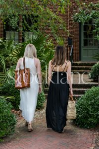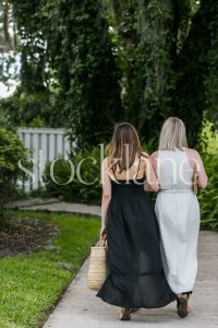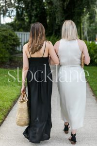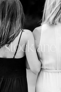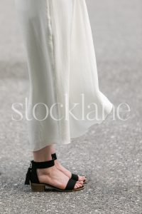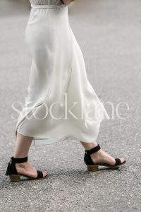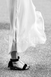 Vertical black and white stock photo of a woman’s legs in a white dress and black shoes.