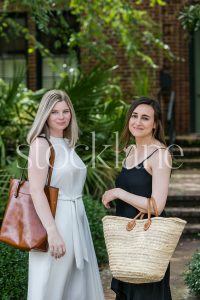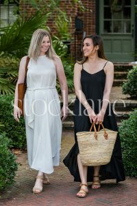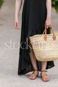 Vertical stock photo of a woman wearing a black summer dress holding a French market basket.