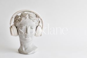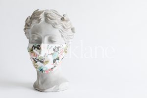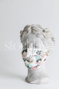 Horizontal stock photo of a woman head sculpture with a floral mask.