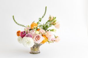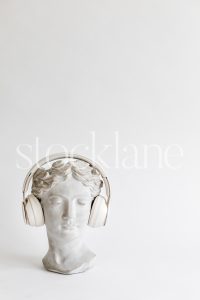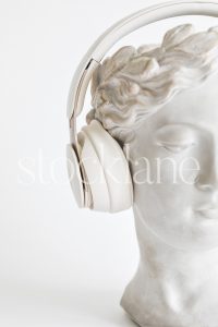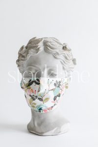 Vertical stock photo of a woman head sculpture with a floral mask.
