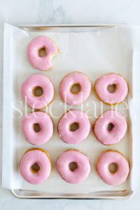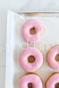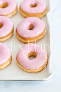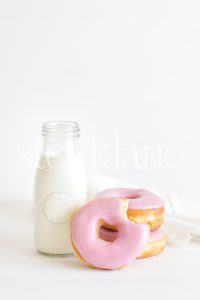 Vertical stock photo of a jar with milk and strawberry frosted donuts.