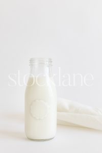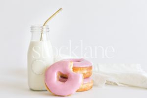 Horizontal stock photo of a jar with milk and strawberry frosted donuts.