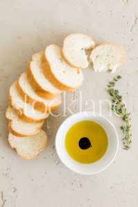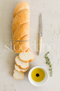 Vertical stock photo of a sliced loaf of bread and olive oil.