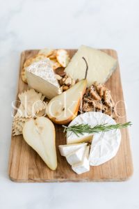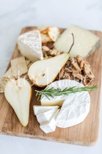 Vertical stock photo of a cheese board with pears, nuts, and crackers