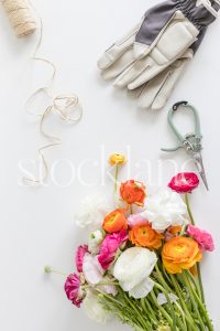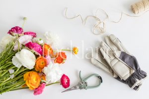 Vertical stock photo of a bouquet of flowers with gardening sheers and gloves