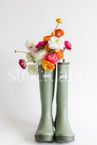 Vertical stock photo of a bouquet of flowers in gardening boots