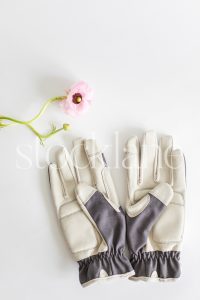 Vertical stock photo of gardening gloves and a pink flower