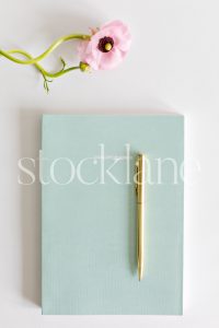 Vertical stock photo a notebook with a pen and a pink flower