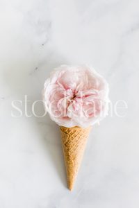 Vertical stock photo of a pink rose on an ice cream cone.