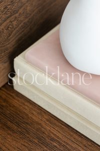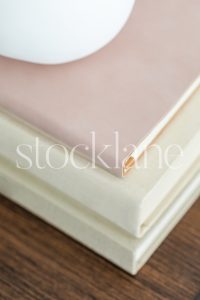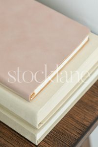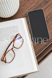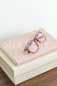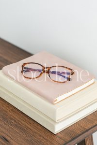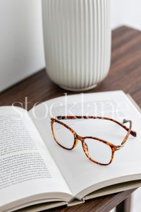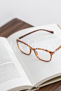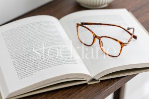 Horizontal stock photo of a book on a desk with a pair of glasses