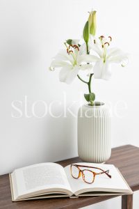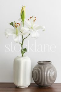 Vertical stock photo of white asian lilies with a white vase and a grey vase
